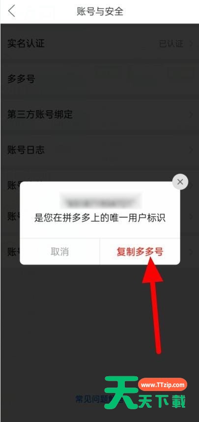 很多小伙伴在使用拼多多的时候,想知道用户标识怎么获得,下面天天下载就为大家分享拼多多用户标识获得方法,感兴趣的小伙伴不要错过哦! 拼多多用户标识怎么获得?拼多多用户标识获得方法 1、首先打开拼多多APP,点击【个人中心】。 2、然后进入个人页面,点击【设置】。 3、进入设置页面,点击【账号与安全】。 4、接着进入账号与安全页面,点击【多多号】。 5、最后点击【复制多多号】,即可获得拼多多用户标识。 谢谢大家的观看,更多手机教程请关注天天下载! @天天下载 除特别注明外,本站所有文章均为 天天下载 原创,转载请注明出处来自 https://www.ttzip.com/28709.html