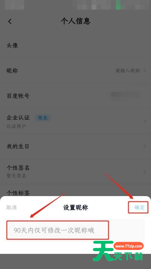 今天天天下载为大家带来了百度网盘设置昵称教程,想知道怎么做的小伙伴来看看接下来的这篇文章吧,相信一定会帮到你们的。 百度网盘怎么设置昵称?百度网盘设置昵称教程 1、首先在手机上打开百度网盘。 2、然后点击“我的”,再点击“设置”。 3、接着在“设置”里点击“个人信息”。 4、在“个人信息”里点击“昵称”。 5、最后输入您的昵称,点击“确定”即可。 希望此教程能帮到大家!更多教程请关注天天下载! @天天下载 除特别注明外,本站所有文章均为 天天下载 原创,转载请注明出处来自 https://www.ttzip.com/28733.html