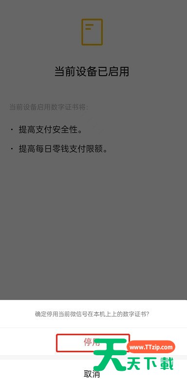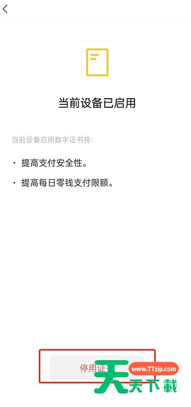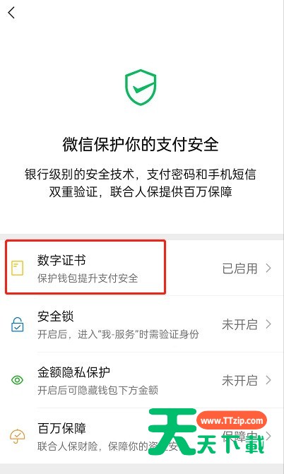 微信数字证书是提升支付安全性的一项功能,不经常使用微信支付的小伙伴可以关闭这项功能,下面为大家讲一下关闭方法,想了解的小伙伴不要错过! 微信怎么停用数字证书?微信停用数字证书方法 1、首先打开微信,点击右下角我的,点击服务。 2、点击钱包。 3、然后点击进入消费者保护。 4、点击安全保障。 5、接着点击进入数字证书。 6、点击停用证书。 7、最后点击停用即可。 谢谢大家阅读观看,希望本文能帮到大家! @天天下载 除特别注明外,本站所有文章均为 天天下载 原创,转载请注明出处来自 https://www.ttzip.com/28813.html