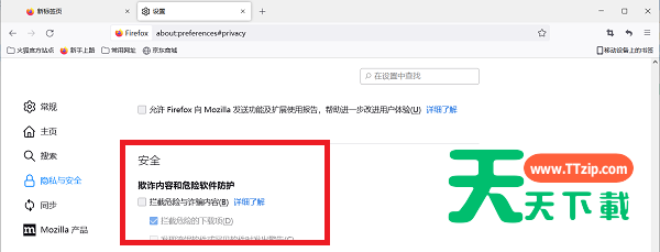 有的小伙伴会问火狐浏览器怎么关闭安全拦截,下面天天下载为大家详细的介绍一下方法,想知道的话就来看看吧,相信一定会帮到你们的。 火狐浏览器怎么关闭安全拦截?火狐浏览器关闭安全拦截方法 1、双击打开软件,点击右上角的三条横线图标。 2、接着点击下方选项列表中的"设置"。 3、在打开的窗口界面中,点击左侧中的"隐私与安全"选项。 4、然后找到右侧"安全"选项中的"拦截危险与诈骗内容",将其小方框取消勾选即可。 希望此教程能帮到大家!更多教程请关注天天下载! @天天下载 除特别注明外,本站所有文章均为 天天下载 原创,转载请注明出处来自 https://www.ttzip.com/28820.html
