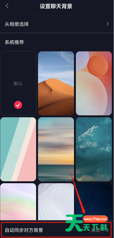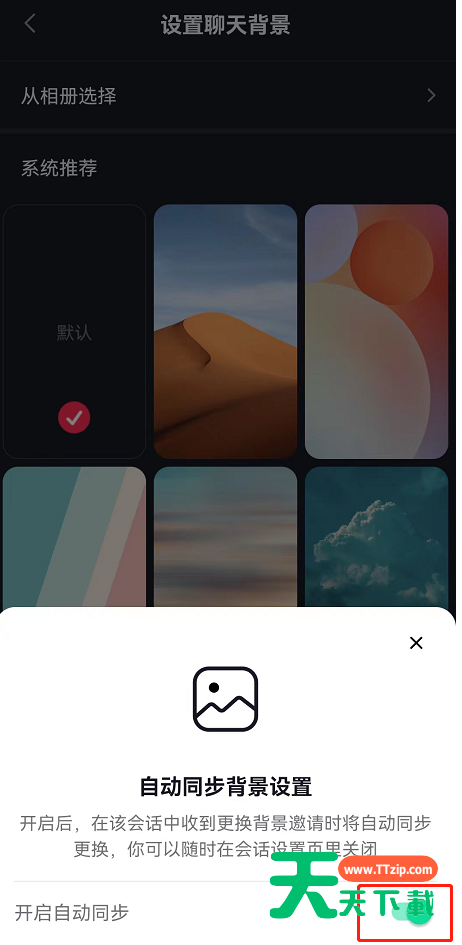 4、接着在聊天背景页面最下方大家可以看到自动同步对方背景功能。