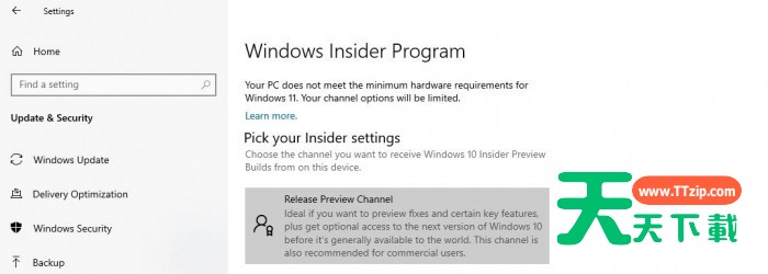 Win11系统在发布的时候,微软就宣布了更新升级的要求,当你在尝试升级Windows11的时候可能会看到以下错误:你的PC不符合Windows11的最低硬件要求。你的渠道选择将受到限制。很多用户不知道该怎么解决?这里天天下载为大家带来让不符合条件的设备升级Windows11的方法步骤,快来看看吧!