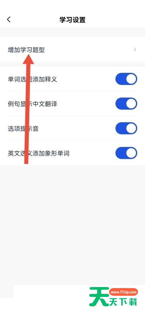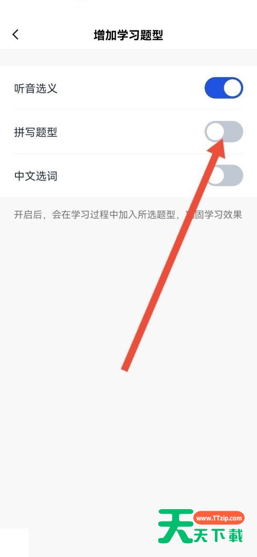百词斩怎么添加拼写题型?有很多的小伙伴会问怎么添加题型,下面就为大家分享百词斩添加拼写题型方法,有需要的可以来了解了解哦。 百词斩怎么添加拼写题型?百词斩添加拼写题型方法 1、首先在手机打开【百词斩】。 2、然后进入页面,点击【我】。 3、接着来到我的主页,点击右上角的设置图标。 4、进入设置,点击【学习设置】。 5、来到学习设置,点击【增加学习提题型】。 6、最后进入增加学习题型,然后点击【拼写题型】的按钮开启即可。 谢谢大家的观看,更多手机教程请关注天天下载! @天天下载 除特别注明外,本站所有文章均为 天天下载 原创,转载请注明出处来自 https://www.ttzip.com/29132.html