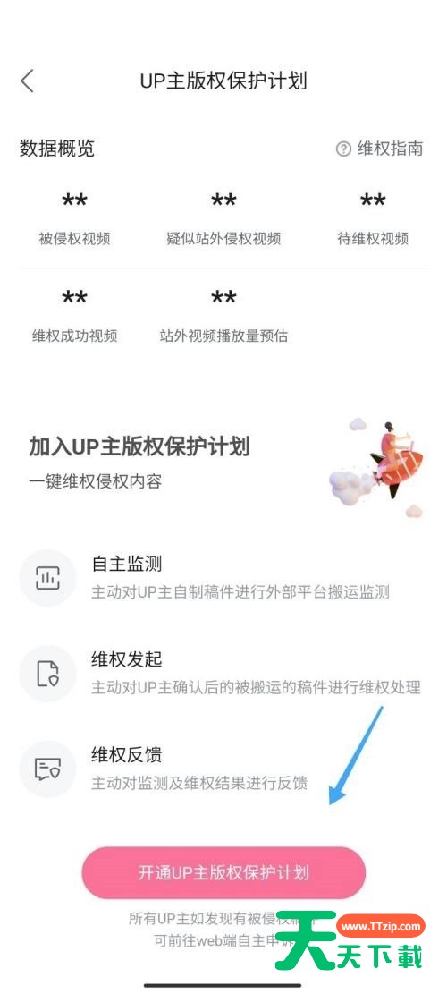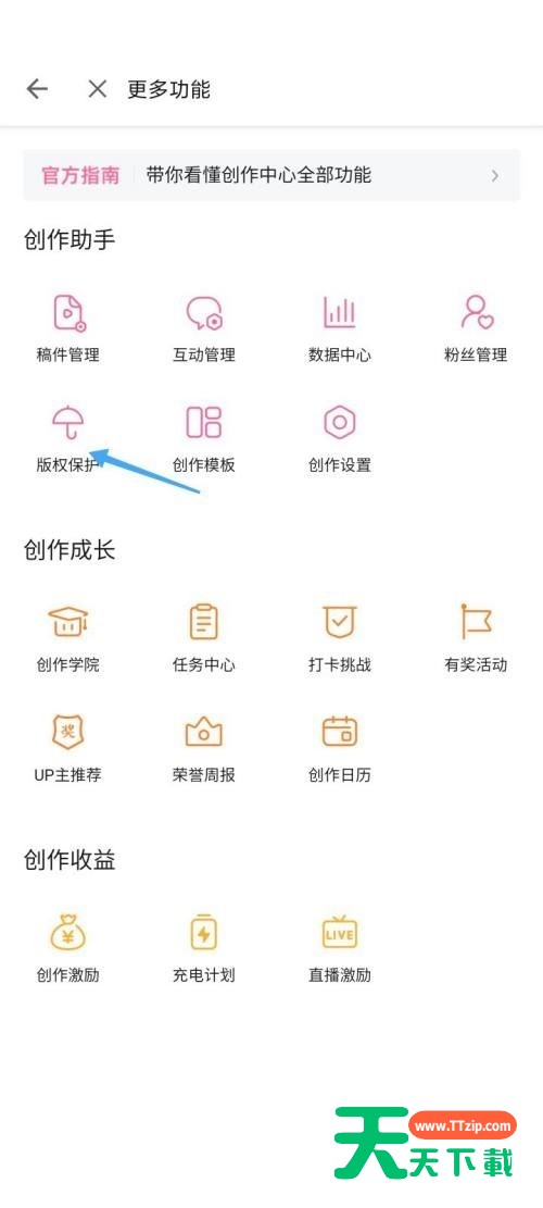 哔哩哔哩中,很多小伙伴不知道如何开启版权保护,下面天天下载就给大家带来哔哩哔哩开启版权保护方法,有需要的小伙伴不要错过哦。 哔哩哔哩如何开启版权保护?哔哩哔哩开启版权保护方法 1、首先在哔哩哔哩我的页面点击【创作首页】。 2、然后在页面中点击【更多功能】。 3、接着进入页面后选择【版权保护】。 4、最后查看保护计划介绍,点击开启UP主版权保护计划。 以上这篇文章就是哔哩哔哩开启版权保护方法的全部内容,更多手机教程请关注天天下载! @天天下载 除特别注明外,本站所有文章均为 天天下载 原创,转载请注明出处来自 https://www.ttzip.com/29136.html