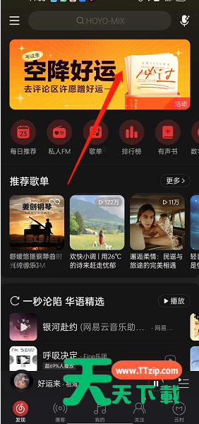 网易云音乐官方最近推出了评论区领好运签活动,很多小伙伴提问该怎么参与此活动,以下就是具体的介绍,赶紧来看看吧。 网易云音乐评论区领好运签怎么参与?网易云音乐评论区领好运签参与教程 1、首先打开软件,选择如图的活动界面,点击进入。 2、然后在歌曲界面评论自己的愿望。 3、评论完成后,界面会显示如图符号。 4、最后你还可以领取自己的好运签。 希望此教程能帮到大家!更多教程请关注天天下载! @天天下载 除特别注明外,本站所有文章均为 天天下载 原创,转载请注明出处来自 https://www.ttzip.com/29479.html
