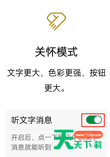 3、开启关怀模式后,将听文字消息功能打开。
