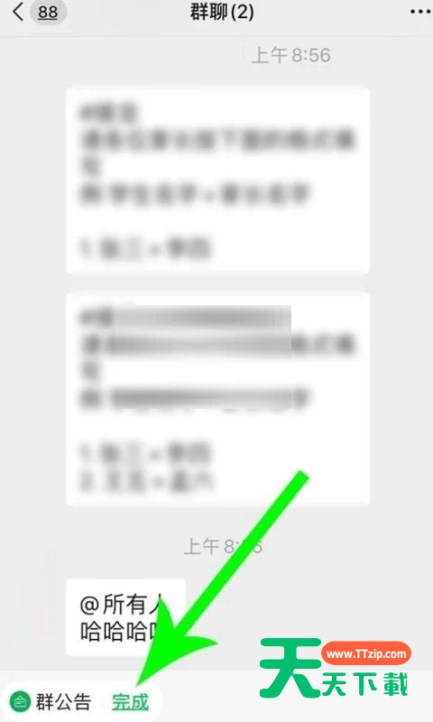微信群中发布了群公告之后,有的小伙伴想点击完成,但不知道该怎么弄。下面天天下载为大家带来了微信完成群公告的方法,小伙伴们可以来一起看看。 微信群公告怎么完成?微信群公告完成方法 1、首先打开微信群聊窗口,然后点击“群公告”。 2、打开群公告以后查看公告内容,然后完成公告任务,接着点击“返回”图标。 3、打开微信群聊窗口,然后点击群公告右侧的“完成”按钮。 4、最后点击后,系统提示您完成群主发布的群待办,然后群成员就会看到你完成群公告的提示信息。 谢谢大家的观看,更多手机教程请关注天天下载! @天天下载 除特别注明外,本站所有文章均为 天天下载 原创,转载请注明出处来自 https://www.ttzip.com/29630.html