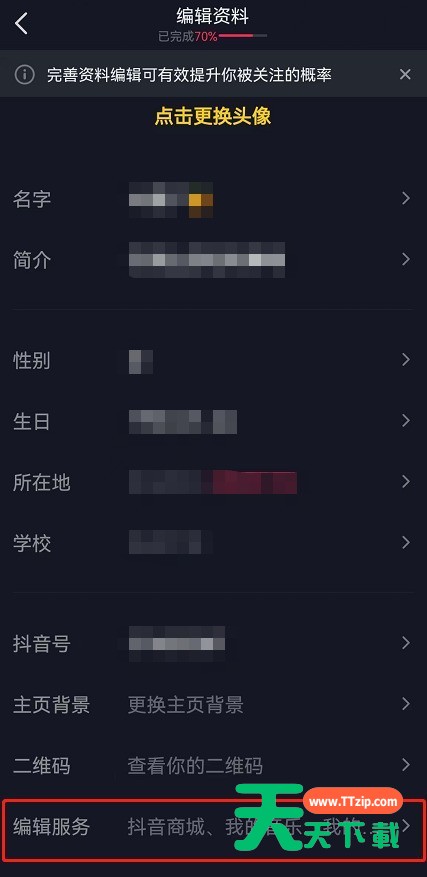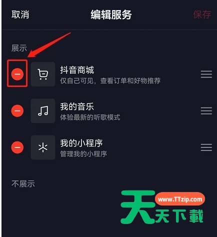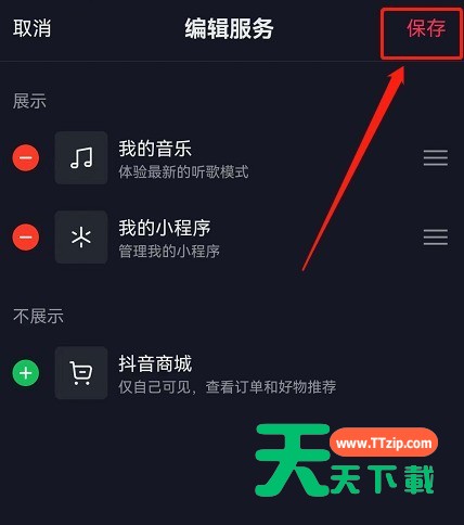 抖音是不少小伙伴每日必刷的视频平台,抖音在首页推出了商城入口,但很多小伙伴感觉不习惯,那就跟着天天下载一起来关闭吧! 抖音主页商城怎么关闭?抖音主页商城关闭方法 1、首先在抖音我的页面点击编辑资料。 2、然后滑到最下方点击编辑服务。 3、接着在此页面中点击抖音商城前方的-号。 4、随后可以看到抖音商城在不展示页面,点击右上角保存。 5、最后返回我的页面就可以看到已经关闭了商城入口。 谢谢大家阅读观看,希望本文能帮到大家! @天天下载 除特别注明外,本站所有文章均为 天天下载 原创,转载请注明出处来自 https://www.ttzip.com/29636.html