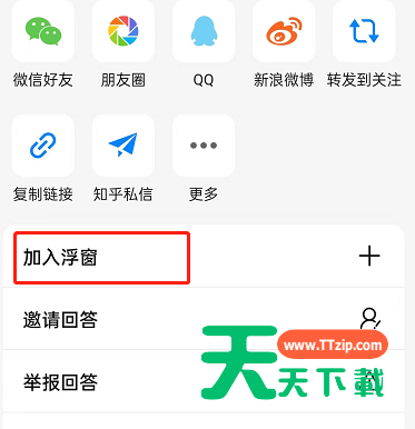 知乎中一个问题很多人有不同的见解,这个时候我们就可以将这个帖子加入到浮窗中,有时间了再看,下面就一起来看看如何加入浮窗吧! 知乎回答怎么加入浮窗?知乎回答加入浮窗教程 1、首先打开知乎,点击进入一个回答,点击右上角三个点。 2、然后点击加入浮窗。 3、接下来找到屏幕右侧浮窗并点击。 4、最后就可以查看到之前添加进去的回答了,点击即可查看。 谢谢大家的观看,更多手机教程请关注天天下载! @天天下载 除特别注明外,本站所有文章均为 天天下载 原创,转载请注明出处来自 https://www.ttzip.com/29659.html