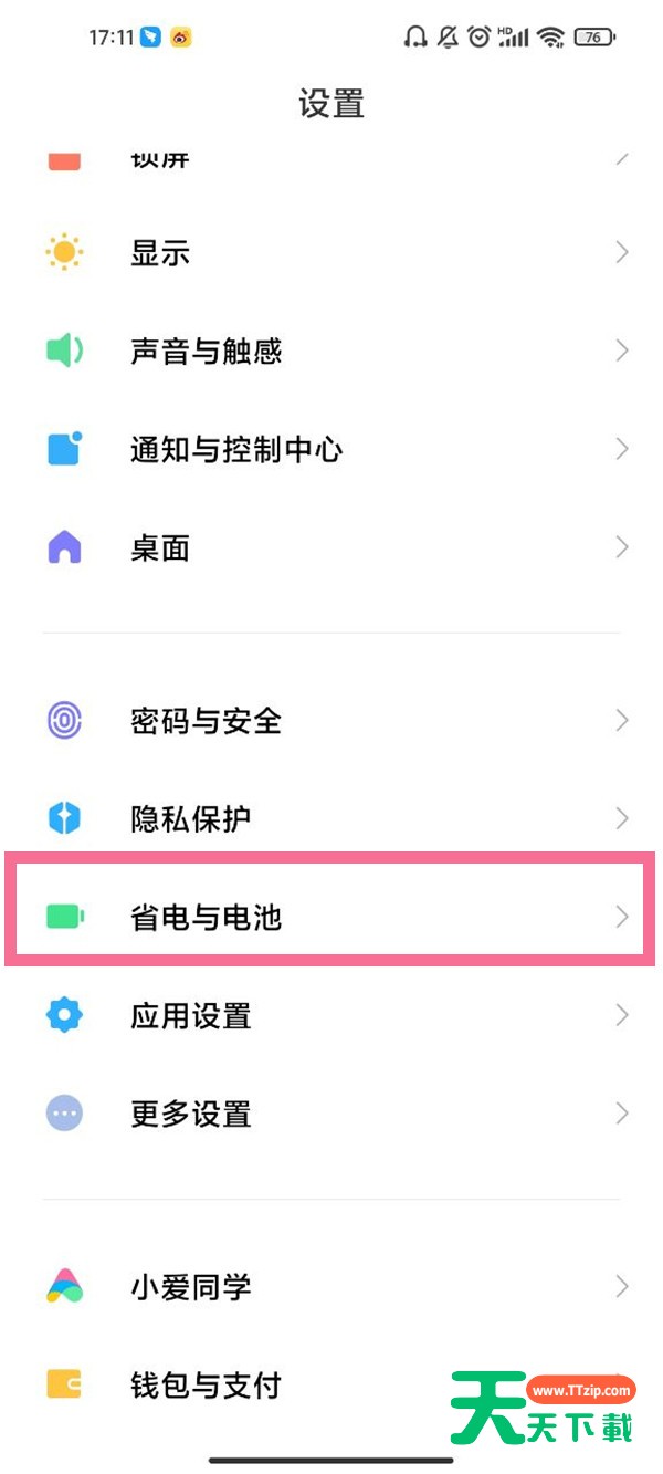 1、首先打开手机设置,点击【省电与电池】选项。