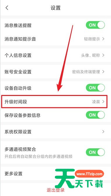 小伙伴们知道萤石云视频怎么设置升级时间段吗?今天天天下载就来讲解萤石云视频设置升级时间段的方法,感兴趣的快跟天天下载一起来看看吧,希望能够帮助到大家。 萤石云视频怎么设置升级时间段?萤石云视频设置升级时间段的方法 1、打开【萤石云视频】。见下图。 2、打开萤石云视频后,在【我的】界面右上角点击轮齿状的按钮。见下图。 3、在【设置】界面,点击【升级时间段】所在行。见下图。 4、在【升级时间段】界面,即可选择需要的时间段。见下图。 以上就是给大家分享的萤石云视频怎么设置升级时间段的全部内容,更多手机教程尽在天天下载! @天天下载 除特别注明外,本站所有文章均为 天天下载 原创,转载请注明出处来自 https://www.ttzip.com/29865.html