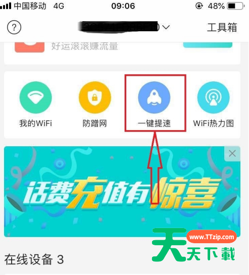 2、然后在网络页面中,可以查看当前wifi的接入设备数,找到并选中“一键提速”。进入“一键提速”页面,选择好你要提速的设备,点击“开始提速”,如下图所示;