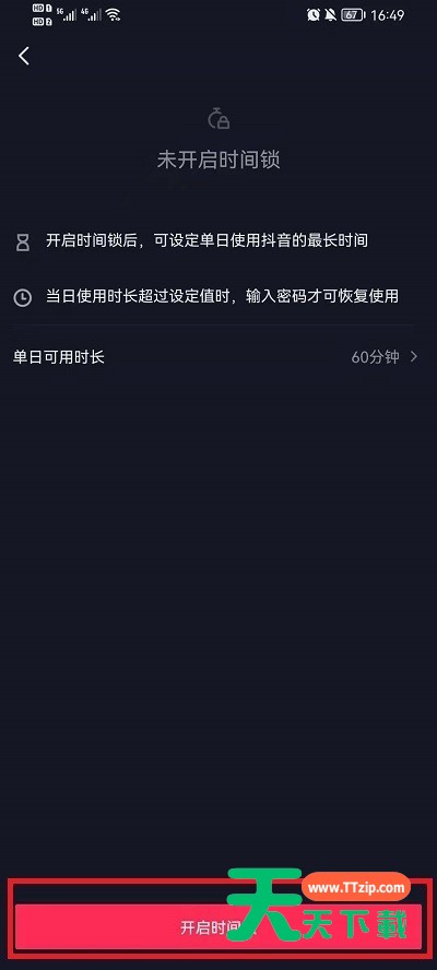 4、最后在时间锁功能界面,点击下方的【开启时间锁】就可以进行时间锁的设定,设定一个时间段提醒用户关闭抖音。
