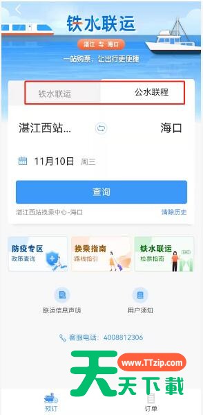 铁路12306上线了铁水联运服务,用户可以直接在上面购买“汽车+轮船”或者“高铁+轮船”的套票前往海南岛。下面天天下载给大家带来了详细的教程,一起来看看吧!