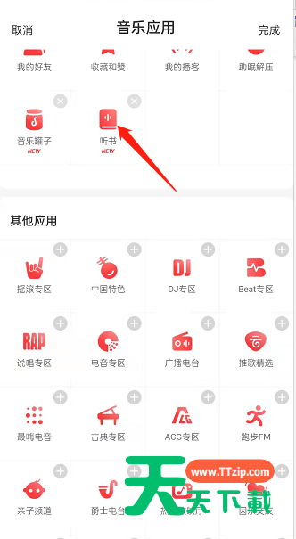 很多人不知道网易云音乐如何切换听书频道?今日为你们带来的文章是网易云音乐切换听书频道的方法,还有不清楚小伙伴和天天下载一起去学习一下吧。 网易云音乐如何切换听书频道?网易云音乐切换听书频道教程 1、打开软件,选择下方的【我的】(如图所示)。 2、点击音乐应用进入听书,如果没有的话,可以点击一下添加(如图所示)。 3、完成添加并进入(如图所示)。 4、然后点击上方的频道键(如图所示)。 5、这样就能更改频道了(如图所示)。 以上就是给大家分享的网易云音乐如何切换听书频道的全部内容,更多精彩内容尽在天天下载! @天天下载 除特别注明外,本站所有文章均为 天天下载 原创,转载请注明出处来自 https://www.ttzip.com/30011.html