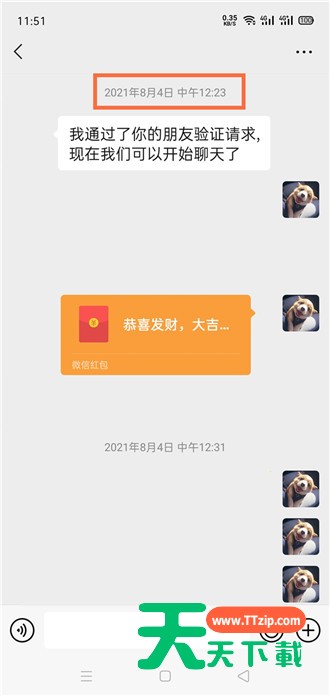 5、最后看到通过验证请求这句话后,上面的时间就是添加好友时间。