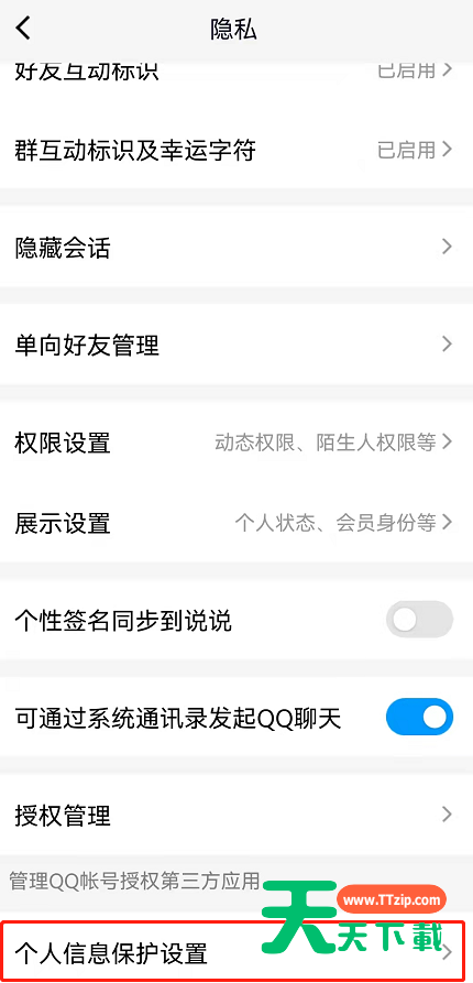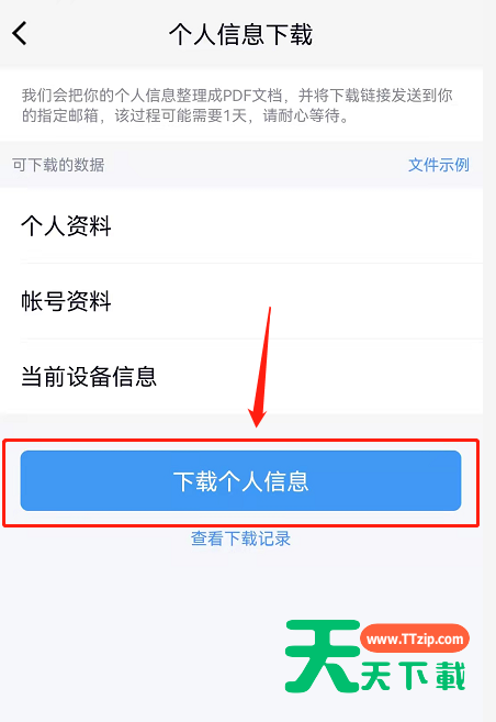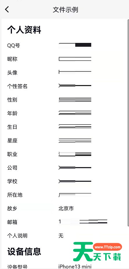 近日有一些小伙伴咨询天天下载QQ如何下载个人信息文件?下面就为大家带来了QQ下载个人信息文件的方法,有需要的小伙伴可以来了解了解哦。 QQ如何下载个人信息文件?QQ下载个人信息文件的方法 1、打开QQ设置。 2、在设置中找到【隐私】进入。 3、在隐私中滑到最下方找到【个人信息保护设置】。 4、在个人信息保护设置中选择【个人信息查询和管理】。 5、进入选择【个人信息下载】 6、最后点击下图框中位置即可下载。 7、下载的文件示例如下。 以上就是给大家分享的QQ如何下载个人信息文件的全部内容,更多精彩内容尽在天天下载! @天天下载 除特别注明外,本站所有文章均为 天天下载 原创,转载请注明出处来自 https://www.ttzip.com/30171.html