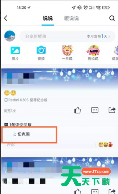 在说说的功能界面中,找到用户想要删除的互动消息,长按进入到更多服务页面。