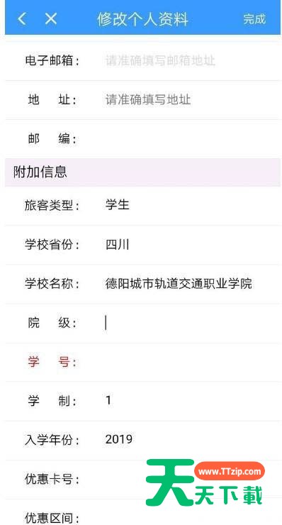 3、找到【附加信息】选项,点击右上角【修改】,在学生类型中选择【学生】,然后按要求添加学校省份、学校名称、院级、学号、优惠区间(优惠区间要写学生证上填写的优惠区间)等信息即可。