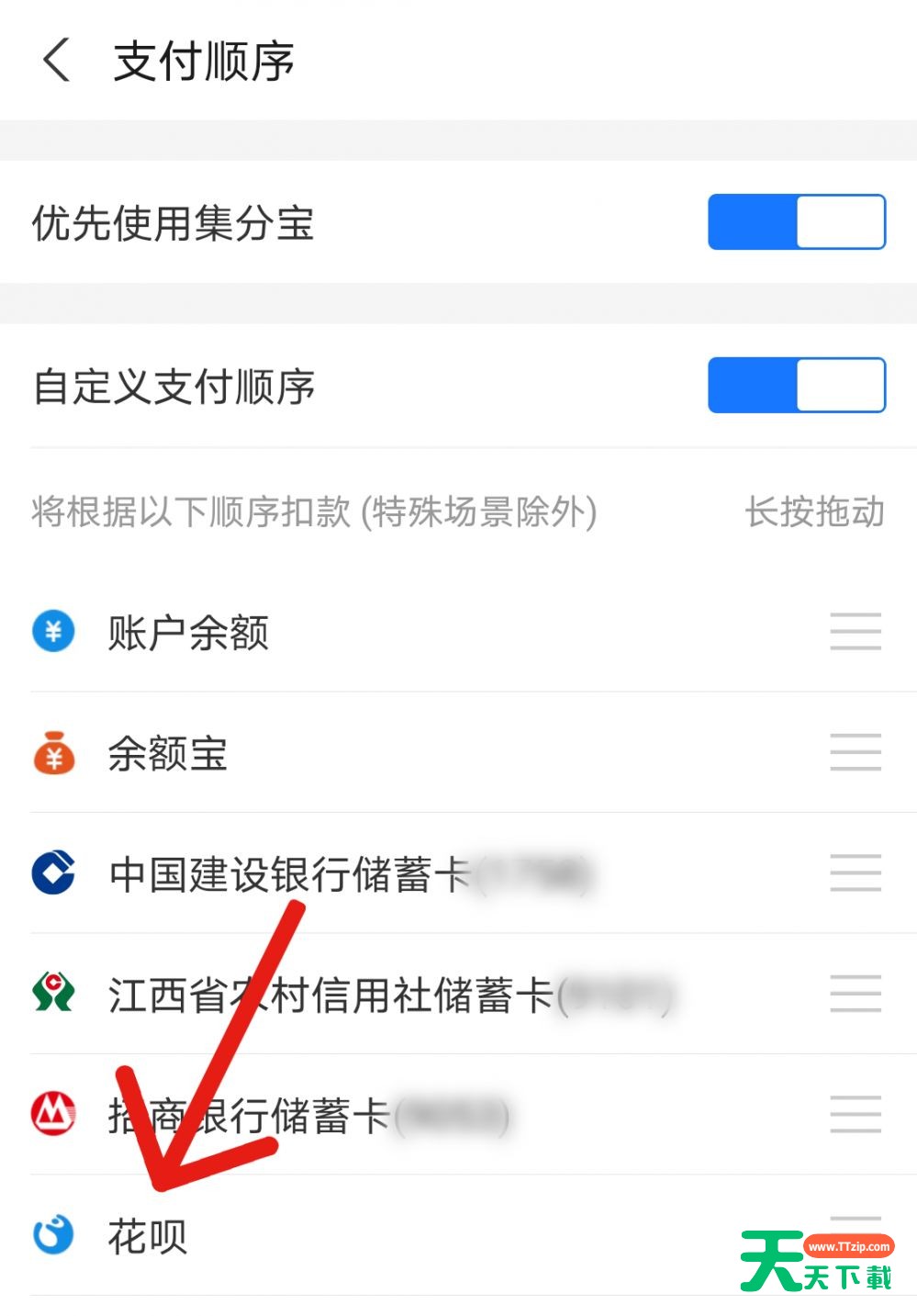 小伙伴们知道支付宝如何取消优先花呗付款吗?今天天天下载就来讲解支付宝取消优先花呗付款的方法,感兴趣的快跟天天下载一起来看看吧,希望能够帮助到大家呢。 支付宝如何取消优先花呗付款?支付宝取消优先花呗付款的方法 1、第一步:打开支付宝app,进入支付宝主界面后点击【我】进入到个人界面后点击右上角【设置】图标; 2、第二步:进入设置界面后点击【支付顺序】; 3、第三步:进入支付顺序界面后将花呗拖动到最后一排就可以了。 以上就是给大家分享的支付宝如何取消优先花呗付款的全部内容,更多手机教程尽在天天下载! @天天下载 除特别注明外,本站所有文章均为 天天下载 原创,转载请注明出处来自 https://www.ttzip.com/30525.html