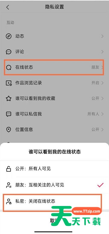 小伙伴们知道快手在线状态怎么设置为私密吗?今天天天下载就来讲解快手在线状态设置为私密的方法,感兴趣的快跟天天下载一起来看看吧,希望能够帮助到大家呢。 快手在线状态怎么设置为私密?快手在线状态设置为私密的方法 1、打开快手app,点击左上角三横线,再点击设置。 2、在设置中点击隐私设置。 3、点击在线状态,再勾选私密即可。 以上就是给大家分享的快手在线状态怎么设置为私密的全部内容,更多精彩内容尽在天天下载! @天天下载 除特别注明外,本站所有文章均为 天天下载 原创,转载请注明出处来自 https://www.ttzip.com/30548.html