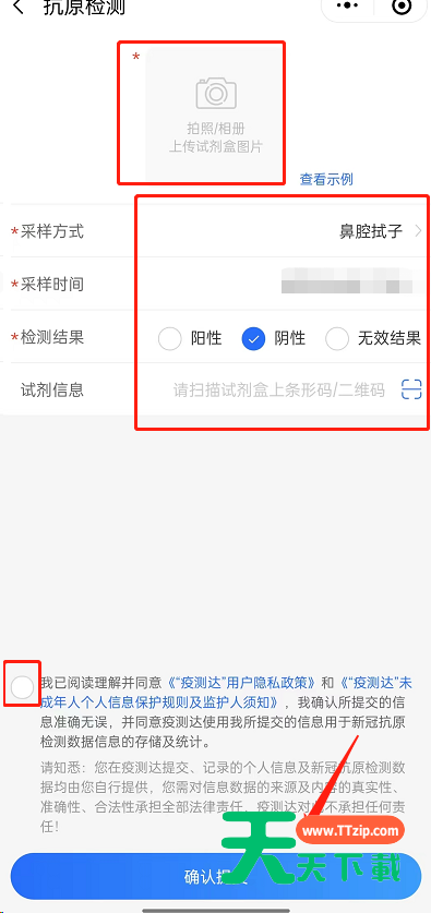 4、随后上传试剂盒照片,填写好信息,勾选好检测结果。最后勾选确认协议,点击确认提交即可。