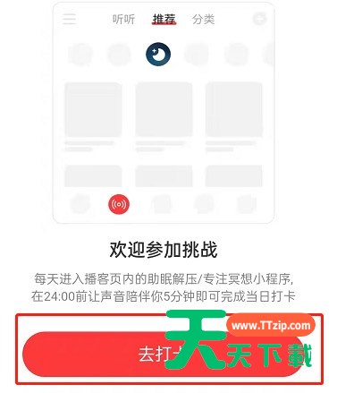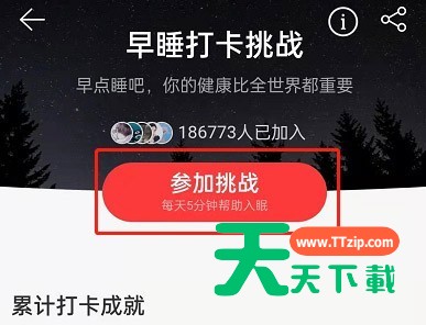 网易云音乐最近新推出了早睡打卡的挑战,很多小伙伴想知道怎么参加,下面天天下载就为大家详细的介绍一下,相信一定会帮到你们的。 网易云音乐如何参加早睡打卡挑战?网易云音乐参加早睡打卡挑战方法 1、首先打开网易云音乐,搜索助眠解压,进入白噪音小程序。 2、然后点击打卡挑战。 3、接着点击参加挑战。 4、随后点击去打卡即可。 以上这篇文章就是网易云音乐参加早睡打卡挑战方法,更多手机教程请关注天天下载! @天天下载 除特别注明外,本站所有文章均为 天天下载 原创,转载请注明出处来自 https://www.ttzip.com/31058.html