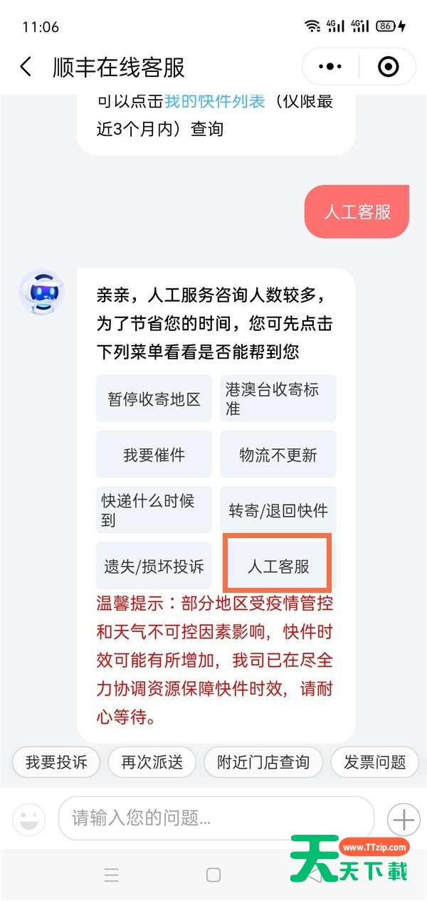 3、接着编辑发送人工服务,对人工服务提出要求并查询快递即可。