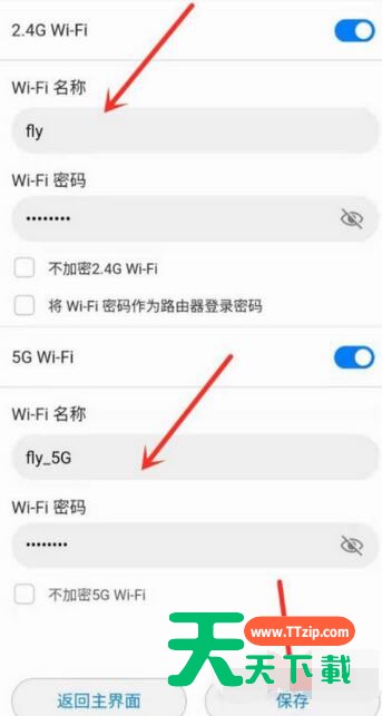 6、最后分别设置2.4g和5g信号的wifi名称和密码,然后点击【保存】即可。