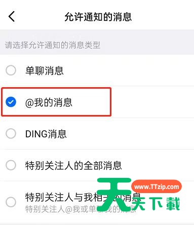 钉钉在哪开启@我消息提醒?很多用户都不知道怎么设置,下面天天下载给大家介绍一下钉钉设置@我消息通知方法,一起来看看吧。 钉钉在哪开启@我消息提醒?钉钉设置@我消息通知方法 1、打开钉钉app,点击下方我的,选择进入设置。 2、点击进入新消息通知。 3、点击允许通知的消息。 4、勾选@我的消息即可。 以上这篇文章就是钉钉设置@我消息通知方法,更多手机教程请关注天天下载! @天天下载 除特别注明外,本站所有文章均为 天天下载 原创,转载请注明出处来自 https://www.ttzip.com/31307.html