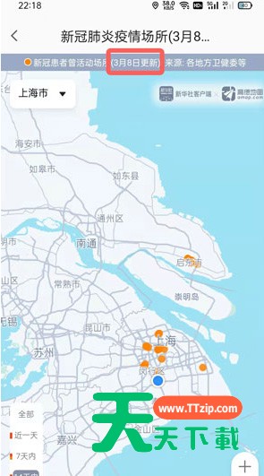 3、在疫情地图的最上方可看到所有数据的获取、更新时间,在地图中看到所在城市的疫情场所;