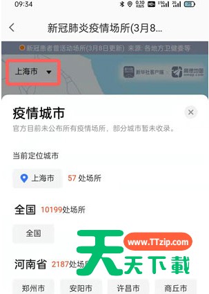 5、同时还可以通过左上角的【城市】,详细查看所在城市疫情场所的数量,以及其他城市的疫情场所数量。
