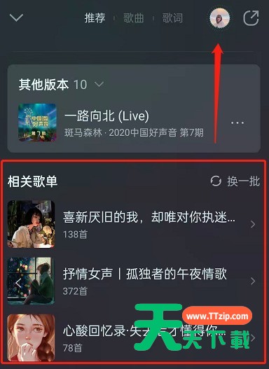 QQ音乐听歌时在哪里查看相关歌单?很多小伙伴还不太了解,下面天天下载给大家带来了QQ音乐查找歌曲相关歌单步骤一览,一起来学习一下! QQ音乐听歌时在哪里查看相关歌单?QQ音乐查找歌曲相关歌单步骤一览 1、打开QQ音乐,点击进入正在听的歌曲。 2、点击最上方的推荐。 3、向上滑动,看到相关歌单,点击进去即可。 以上这篇文章就是QQ音乐查找歌曲相关歌单步骤一览,更多精彩内容尽在天天下载! @天天下载 除特别注明外,本站所有文章均为 天天下载 原创,转载请注明出处来自 https://www.ttzip.com/31440.html