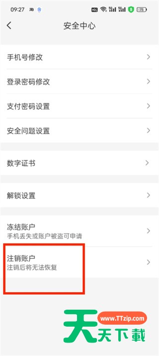 4、之后进入到安全中的页面可以看到有手机号修改、支付密码设置、注销账号等,点击【注销账户】;