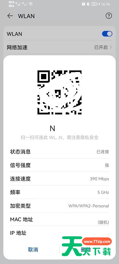3、点击后就会弹出无线网的相关信息,还有一个二维码,扫一扫二维码就可以看到无线网的密码,或者是直接链接该网络。