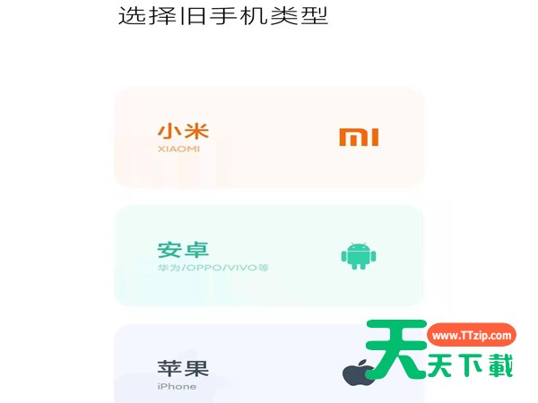 2、然后华为手机在旧手机类型页面点击安卓,小米手机在新手机类型里选择小米。
