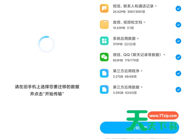 4、最后在旧手机里选择要传输的数据,点击开始传输即可。