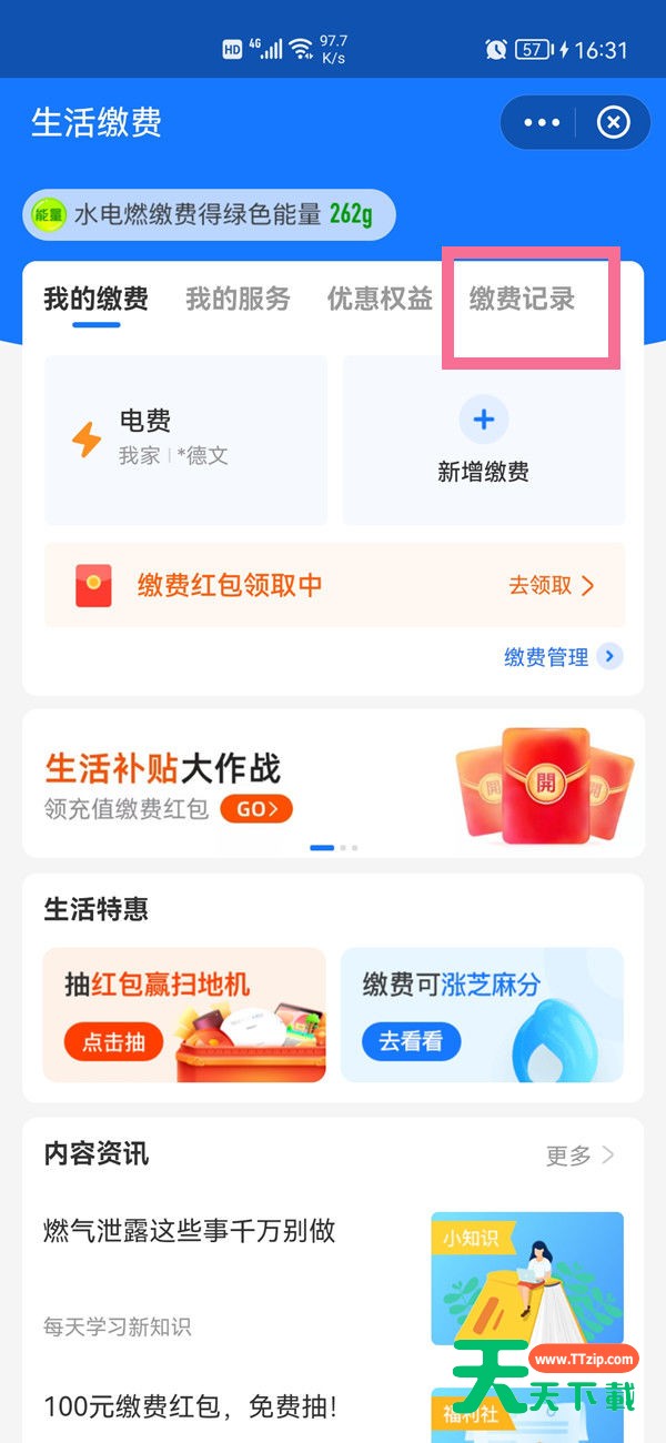 很多小伙伴还不太清楚支付宝在哪里删除已缴费账单?下面天天下载给大家带来了支付宝删除生活缴费记录方法介绍,一起来看看吧。 支付宝在哪里删除已缴费账单?支付宝删除生活缴费记录方法介绍 1、打开支付宝首页,点击进入 生活缴费 。 2、点击 缴费记录 。 3、长按需要删除的记录,点击 删除 即可。 以上这篇文章就是支付宝删除生活缴费记录方法介绍,更多精彩内容尽在天天下载! @天天下载 除特别注明外,本站所有文章均为 天天下载 原创,转载请注明出处来自 https://www.ttzip.com/31770.html