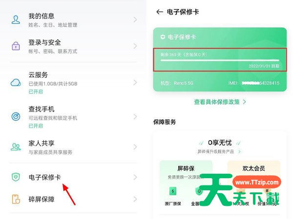 2、点击【电子保修卡】,保修截止日期往前一年时间就是手机激活时间。