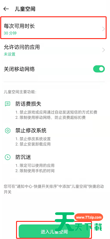 很多用户微信吧OPPO手机如何开儿童模式?下面天天下载给大家介绍OPPO手机开启儿童空间方法,有需要的小伙伴就一起来看看吧。 OPPO手机如何开儿童模式?OPPO手机开启儿童空间方法 1、来到设置页面,进入隐私。 2、点击进入儿童空间。 3、在儿童空间页面中,可以设置每次可用时长和允许访问的应用,设置完成点击进入儿童空间即可。 以上这篇文章就是OPPO手机开启儿童空间方法介绍,更多手机教程请关注天天下载! @天天下载 除特别注明外,本站所有文章均为 天天下载 原创,转载请注明出处来自 https://www.ttzip.com/32100.html