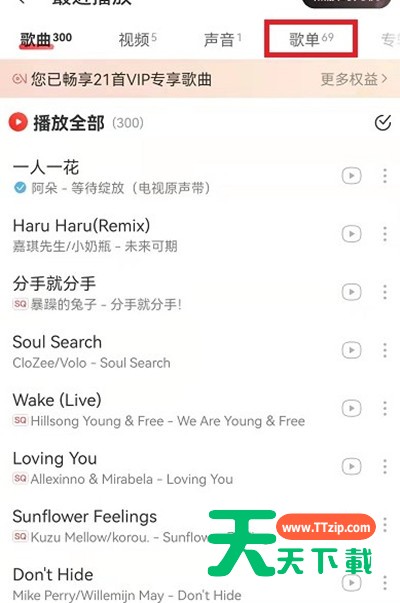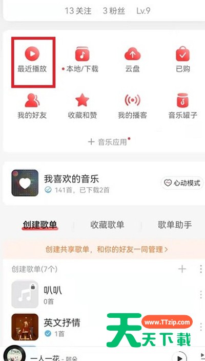 很多小伙伴都不知道网易云音乐歌单播放记录怎么查询?下面天天下载给大家介绍一下网易云音乐查询歌单播放记录方法,一起来看看吧。 网易云音乐歌单播放记录怎么查询?网易云音乐查询歌单播放记录方法 1.打开网易云音乐,然后点击下面的我的选项。 2.点击我的之后,然后找到最近播放并点击进入。 3.进入最近播放之后,就可以看到上面有歌单的按钮,点击一下就可以看到歌单播放记录了。 以上这篇文章就是网易云音乐查询歌单播放记录方法,更多手机教程请关注天天下载! @天天下载 除特别注明外,本站所有文章均为 天天下载 原创,转载请注明出处来自 https://www.ttzip.com/32142.html
