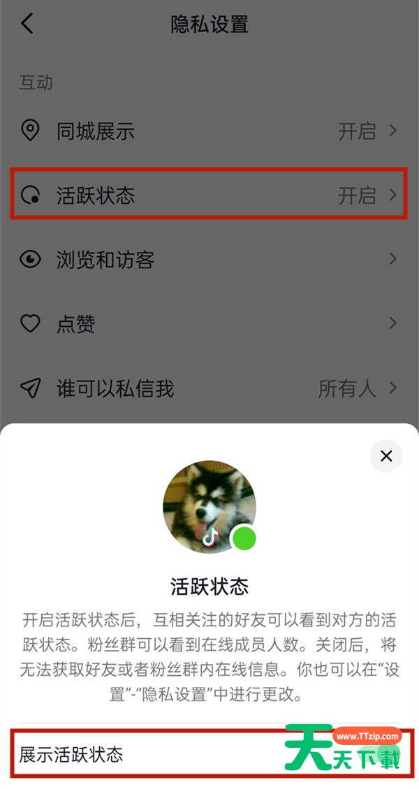 现在抖音也可以设置活跃状态,那我们就可以关注自己的好友们是否活跃在抖音,那抖音怎么设置隐身不在线?下面天天下载给大家带来了抖音关闭活跃状态方法介绍,一起来看看吧! 抖音怎么设置隐身不在线?抖音关闭活跃状态方法介绍 1、打开抖音,点击三横图标,选择设置。 2、点击隐私设置。 3、点击活跃状态,关闭展示活跃状态功能即可。 以上这篇文章就是抖音关闭活跃状态方法介绍,更多手机教程请关注天天下载! @天天下载 除特别注明外,本站所有文章均为 天天下载 原创,转载请注明出处来自 https://www.ttzip.com/32157.html