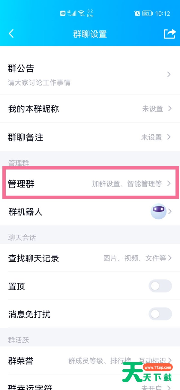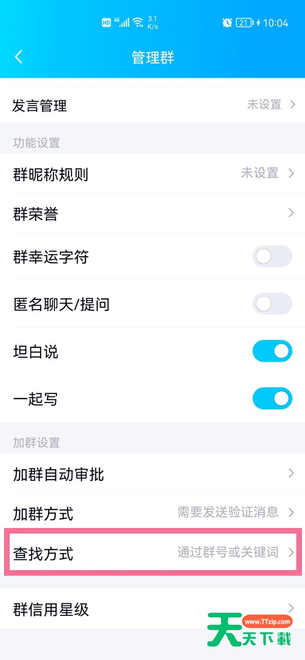 很多小伙伴还不知道QQ群如何关闭允许搜索?下面就是天天下载带来的QQ群禁止被搜索方法介绍,如果需要的话,来和天天下载一起看一下吧。 QQ群如何关闭允许搜索?QQ群禁止被搜索方法介绍 1、点击QQ群聊界面右上角的三横,选择【管理群】。 2、下滑找到加群选项,点击【查找方式】。 3、将【允许被搜索】右侧的开关关闭即可。 以上这篇文章就是QQ群禁止被搜索方法介绍,更多手机教程请关注天天下载! @天天下载 除特别注明外,本站所有文章均为 天天下载 原创,转载请注明出处来自 https://www.ttzip.com/32172.html