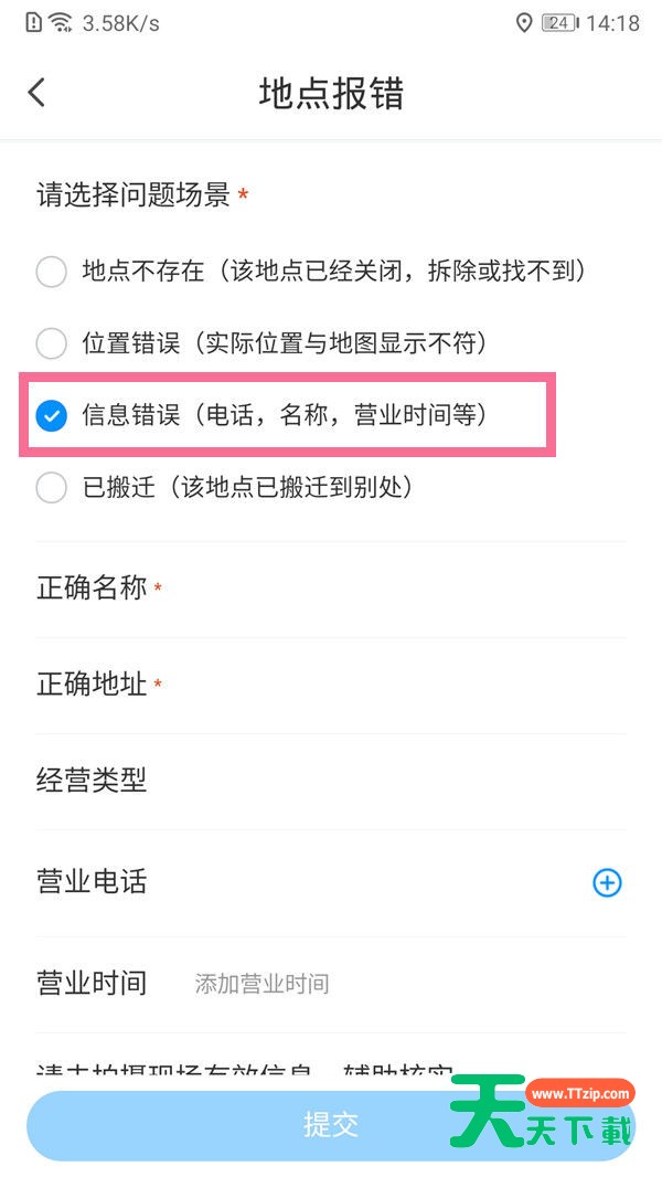 腾讯地图是一款地图导航软件,商家可以把自己的商铺添加到地图上,这样他人就能查阅到自己的店铺了。那腾讯地图店铺名称怎样修改?很多小伙伴还不了解,下面天天下载给大家带来了腾讯地图修改商店名称方法一览,一起来看看吧。 腾讯地图店铺名称怎样修改?腾讯地图修改商店名称方法一览 1、打开腾讯地图,点击右侧竖状工具栏,点击【上报】。 2、选择【报错】,进入【地点报错】。 3、搜索需要更改的店铺名称,点击信息错误选项后,填写正确的名称后【提交】即可。 以上这篇文章就是腾讯地图修改商店名称方法一览,更多手机教程请关注天天下载! @天天下载 除特别注明外,本站所有文章均为 天天下载 原创,转载请注明出处来自 https://www.ttzip.com/32173.html