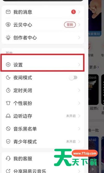 网易云音乐怎么设置关注歌手不可见?很多人想设置自己的关注不给别人查看,不知道怎么设置,下面天天下载给大家介绍一下网易云音乐设置关注歌手不可见教程,一起来看看吧。 网易云音乐怎么设置关注歌手不可见?网易云音乐设置关注歌手不可见教程 1.打开网易云音乐,然后点击左上角的三条横线。 2.进入网易云菜单之后,然后点击里面的设置选项。 3.进入设置之后,然后点击消息和隐私设置选项。 4.进入消息和隐私设置之后,找到其他人可以看到我关注的歌手功能点击右侧的滑块关闭即可。 以上这篇文章就是网易云音乐设置关注歌手不可见教程,更多手机教程请关注天天下载! @天天下载 除特别注明外,本站所有文章均为 天天下载 原创,转载请注明出处来自 https://www.ttzip.com/32263.html