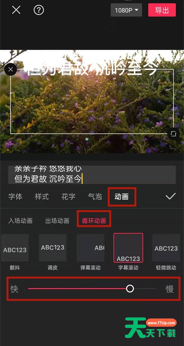 4、最后在动画的循环动画里,选择字幕滚动,然后拉动横条即可变慢滚动速度。
