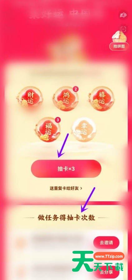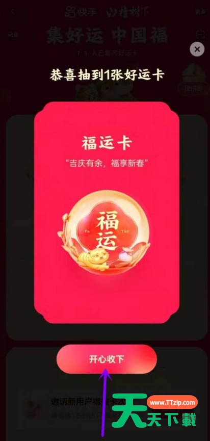 很多人不知道快手2022集卡活动怎么玩?今日为你们带来的文章是快手2022集卡活动的玩法介绍,还有不清楚小伙伴和天天下载一起去学习一下吧。 快手2022集卡活动怎么玩?快手2022集卡活动玩法介绍 1、打开软件,选择上方的【春节】。 2、点击右下角的集好运。 3、选择下方的抽卡。 4、抽到后收下,集完全部的卡片后,你就能参与活动了。 以上就是给大家分享的快手2022集卡活动怎么玩的全部内容,更多精彩内容尽在天天下载! @天天下载 除特别注明外,本站所有文章均为 天天下载 原创,转载请注明出处来自 https://www.ttzip.com/32386.html