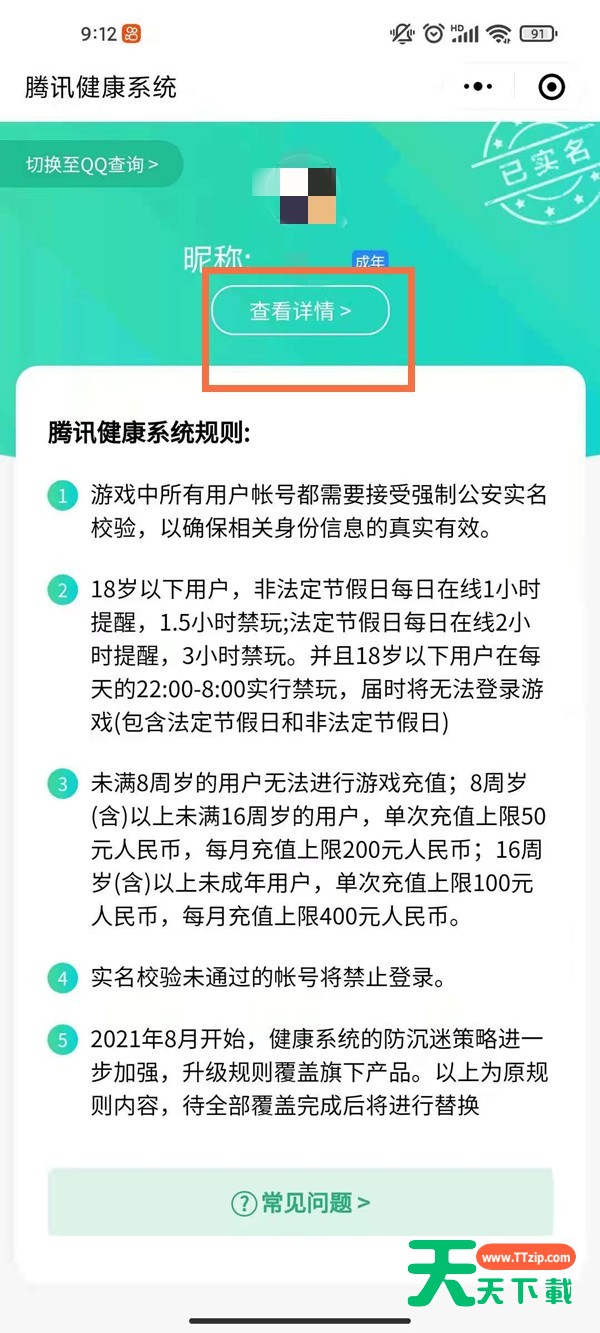在微信小程序中有各种游戏玩在线玩,那微信游戏实名认证怎么更改的呢,下面天天下载给大家介绍一下微信更改游戏实名认证方法,一起来看看吧~ 微信游戏实名认证怎么更改?微信更改游戏实名认证方法介绍 对于已经纳入防沉迷保护的未成年用户均无法修改实名认证。其他用户提供了一年可修改一次实名认证的机会,且修改时需要进行人脸识别。具体操作如下: 1、打开微信,进入腾讯成长守护公众号,点击帮助,再点击健康系统。 2、在健康系统页面点击实名认证查询。 3、点击查看详情,再点击修改实名信息即可。 以上这篇文章就是微信更改游戏实名认证方法介绍,更多手机教程请关注天天下载! @天天下载 除特别注明外,本站所有文章均为 天天下载 原创,转载请注明出处来自 https://www.ttzip.com/32459.html