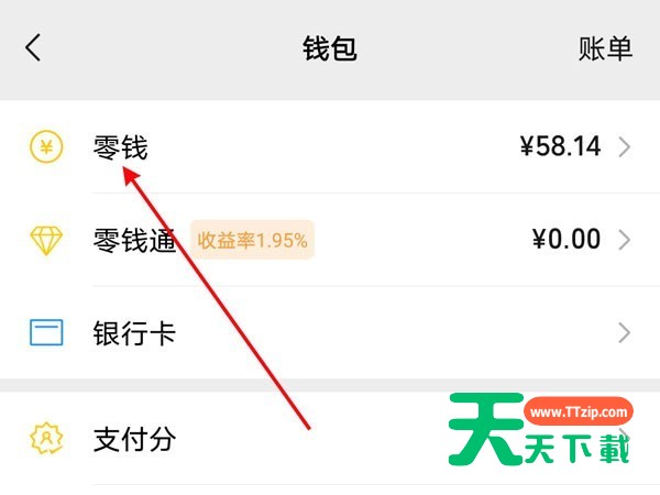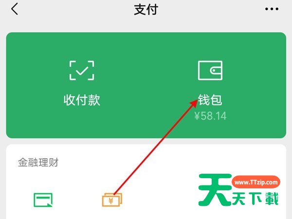 第二步:在支付页面点击钱包,点击零钱。