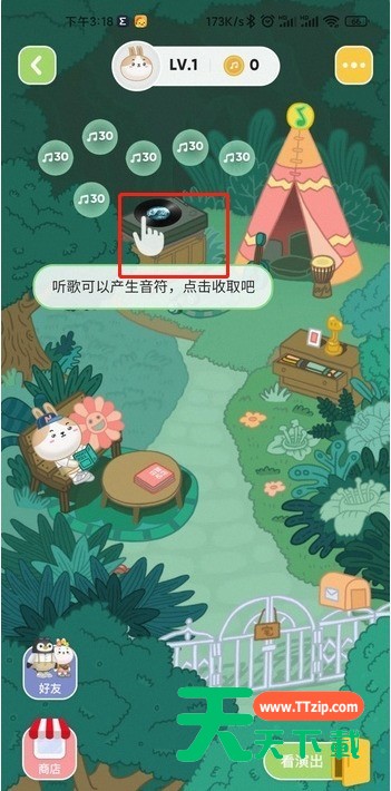 2、每日听歌产生音符,点击即可收取,每听一分钟歌曲可积累一个音符,30 个音符合成一个音符球。每个用户每天最多获取 180 个音符。除了听歌外,还可以通过排行榜好友串门去帮收帮逗好友宠物得到音符。